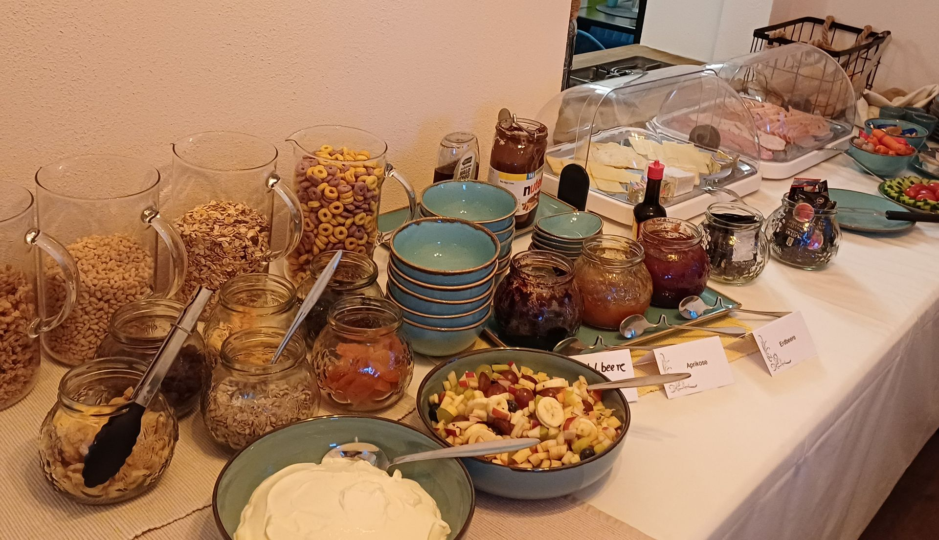 Tägliches Frühstücksbuffet von 8:00 bis 10:30 Uhr. Wir bieten frische Eierspeisen, Joghurt mit hausgemachtem Obstsalat, verschiedene Müslis sowie frisch gebackene Brötchen.